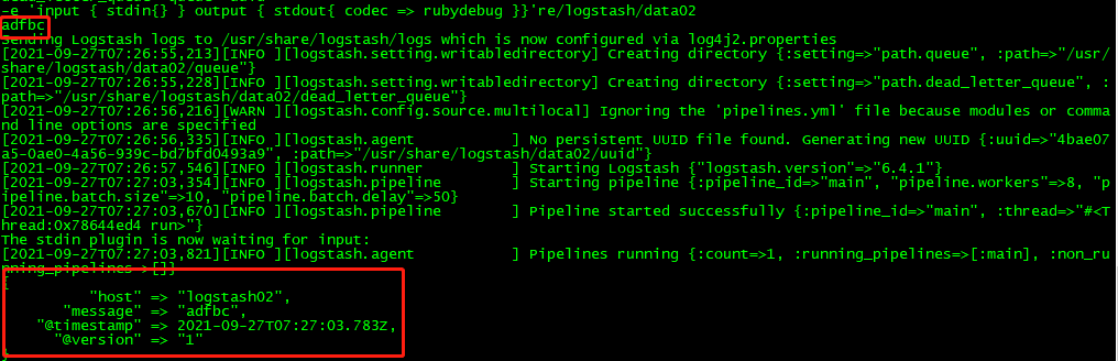 /usr/share/logstash/bin/logstash --path.data /usr/share/logstash/data02 -e 'input { stdin{} } output { stdout{ codec => rubydebug }}'