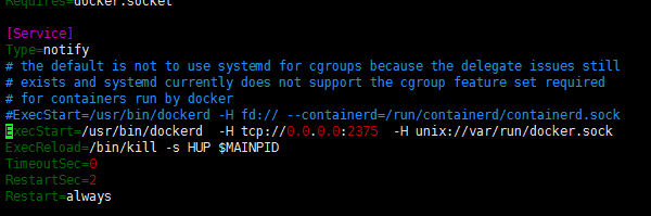 [root@izwz9eftauv7x69f5jvi96z docker]# vim /lib/systemd/system/docker.service #修改ExecStart這行 ExecStart=/usr/bin/dockerd -H tcp://0.0.0.0:2375 -H unix:///var/run/docker.sock