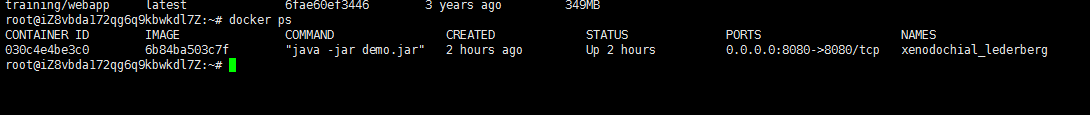 執(zhí)行docker ps可以看到,鏡像已經(jīng)生產(chǎn)容器開始運行: