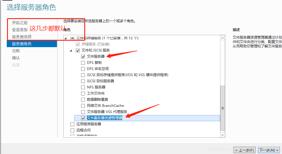 到服務(wù)器角色這一步的時候,選中文件服務(wù)器和文件服務(wù)器資源管理器