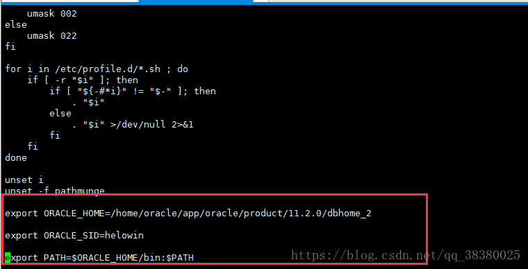 export ORACLE_HOME=/home/oracle/app/oracle/product/11.2.0/dbhome_2 export ORACLE_SID=helowin export PATH=$ORACLE_HOME/bin:$PATH