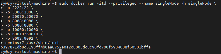 sudo docker run -itd --privileged --name singleNode -h singleNode \ -p 2222:22 \ -p 3306:3306 \ -p 50070:50070 \ -p 8088:8088 \ -p 8080:8080 \ -p 10000:10000 \ -p 60010:60010 \ -p 9092:9092 \ centos:7 /usr/sbin/init