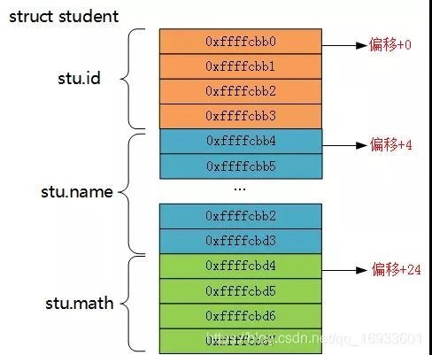 //結(jié)構(gòu)體的地址 Student:0xffffcbb0 //結(jié)構(gòu)體第一個(gè)成員的地址 stu.ID:0xffffcbb0 //偏移地址 +0 stu.name:0xffffcbb4//偏移地址 +4 stu.math:0xffffcbd4//偏移地址 +24