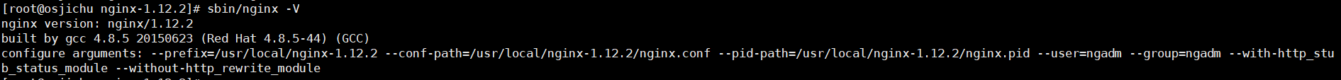 ./configure --prefix=/usr/local/nginx-1.12.2 --conf-path=/usr/local/nginx-1.12.2/nginx.conf --pid-path=/usr/local/nginx-1.12.2/nginx.pid --user=ngadm --group=ngadm --with-http_stub_status_module --without-http_rewrite_module make && make install