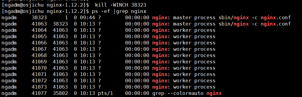 kill –WINCH 38323 (舊進程PID為38323) ps -ef |grep nginx