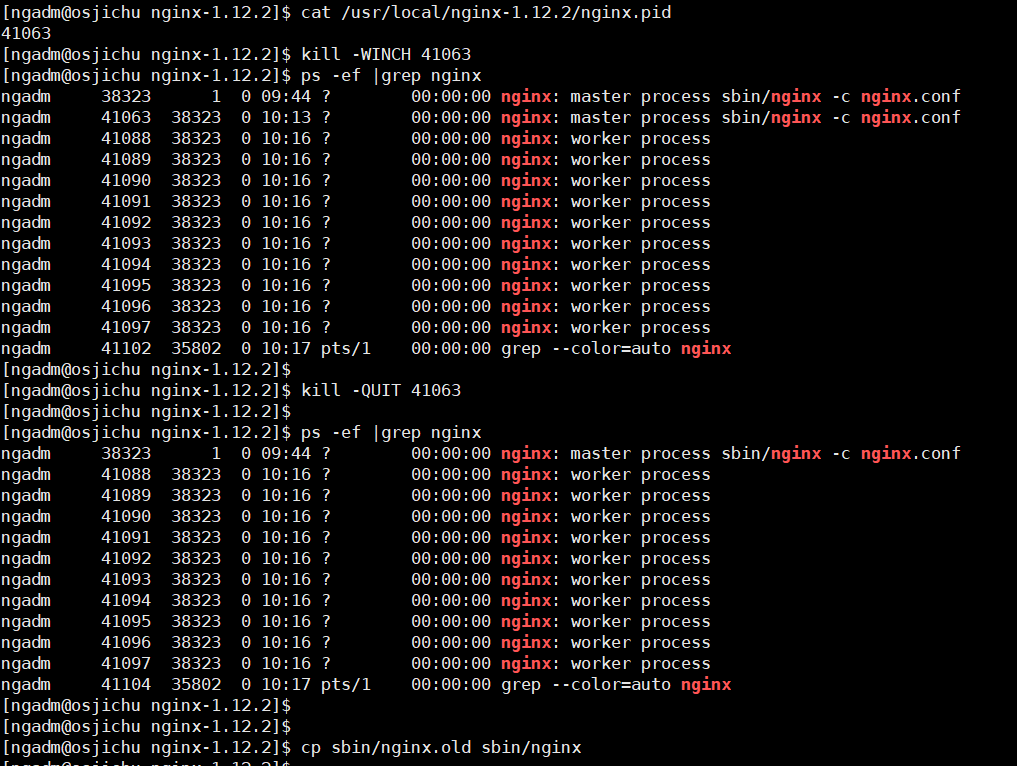 kill -WINCH 新masterPID kill -QUIT 新masterPID cp /usr/local/nginx-1.12.2/sbin/nginx.old /usr/local/nginx-1.12.2/sbin/nginx
