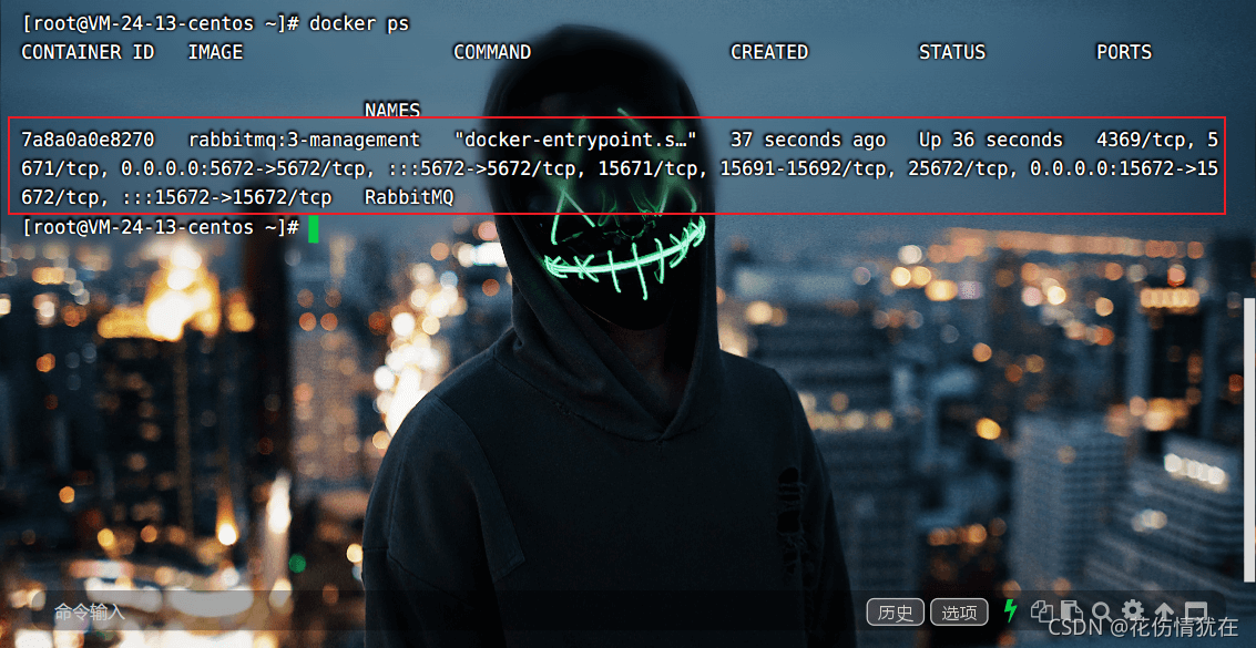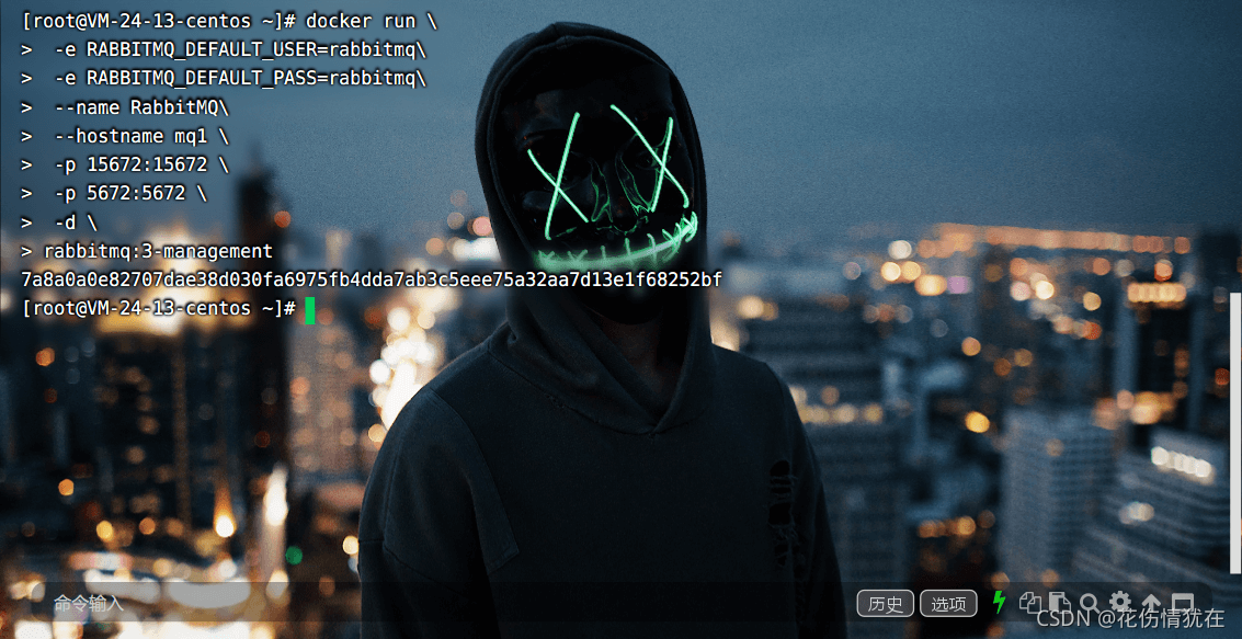 --name RabbitMQ:定義容器名稱--hostname mq1:定義MQ主機名稱-p 15672:15672:映射端口15672------>RabbitMQ管理平臺的端口-p 5672:5672:映射端口5672------>RabbitMQ消息通信的端口,消息的收發(fā)都通過這個端口-d:后臺運行rabbitmq:鏡像名稱,不加版本號默認為latest版本