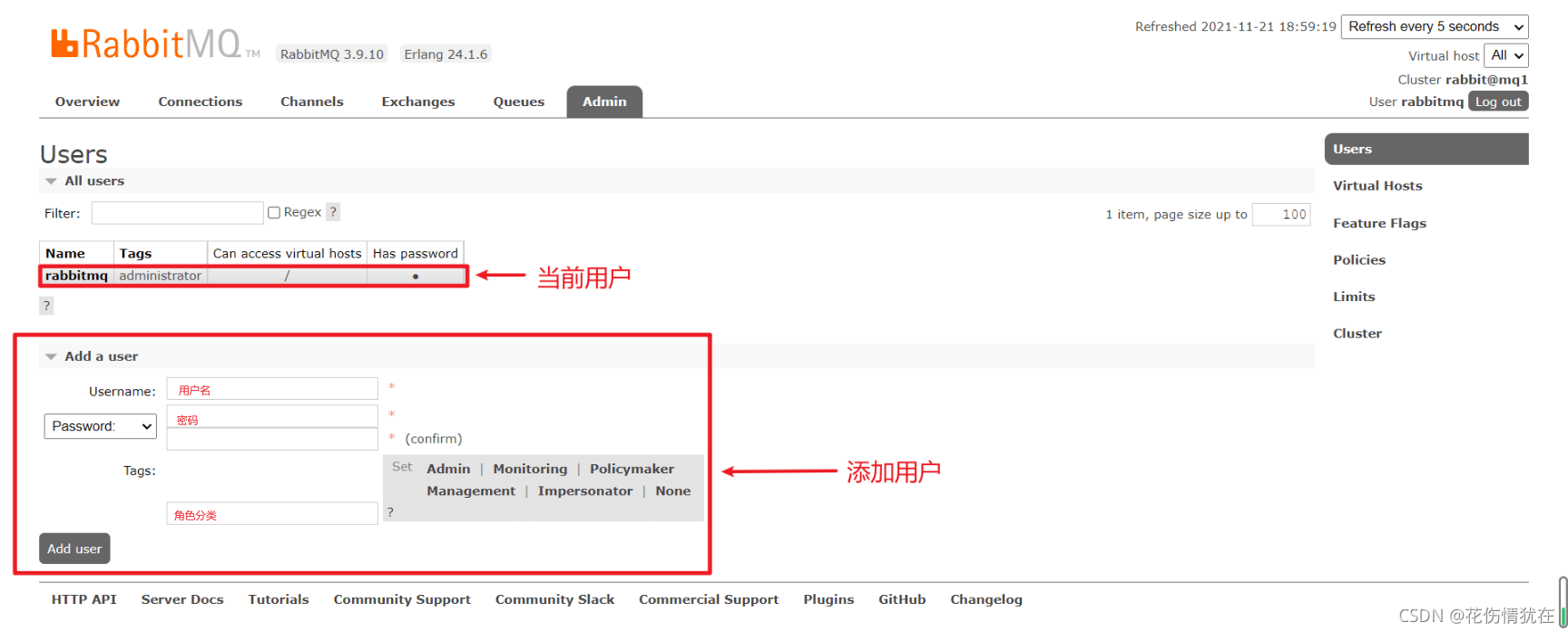 RABBITMQ_DEFAULT_USER=rabbitmq:用戶名RABBITMQ_DEFAULT_PASS=rabbitmq:密碼- 將來我們?nèi)ピL問MQ或者是登錄MQ管理平臺,都需要這個賬號和密碼
