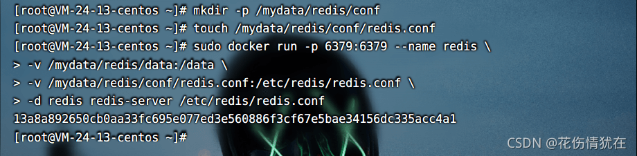 sudo docker run -p 6379:6379 --name redis \ -v /mydata/redis/data:/data \ -v /mydata/redis/conf/redis.conf:/etc/redis/redis.conf \ -d redis redis-server /etc/redis/redis.conf