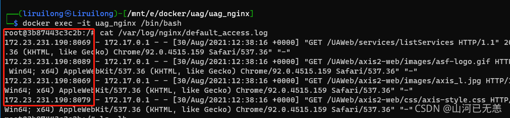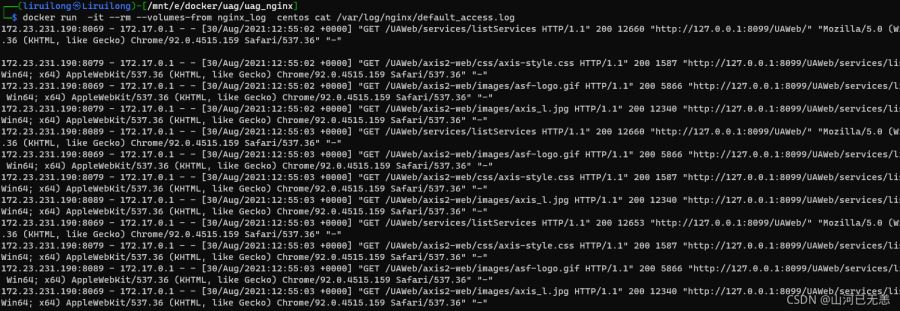 ┌──(liruilong㉿Liruilong)-[/mnt/e/docker/uag/uag_nginx] └─$ docker run -it --rm --volumes-from nginx_log centos cat /var/log/nginx/default_access.log 172.23.231.190:8069 - 172.17.0.1 - - [30/Aug/2021:12:55:02 +0000] "GET /UAWeb/services/listServices HTTP/1.1" 200 12660 "http://127.0.0.1:8099/UAWeb/" "Mozilla/5.0 (Windows NT 10.0; Win64; x64) AppleWebKit/537.36 (KHTML, like Gecko) Chrome/92.0.4515.159 Safari/537.36" "-" 172.23.231.190:8079 - 172.17.0.1 - - [30/Aug/2021:12:55:02 +0000] "GET /UAWeb/axis2-web/css/axis-style.css HTTP/1.1" 200 1587 "http://127.0.0.1:8099/UAWeb/services/listServices" "Mozilla/5.0 (Windows NT 10.0; Win64; x64) AppleWebKit/537.36 (KHTML, like Gecko) Chrome/92.0.4515.159 Safari/537.36" "-" 172.23.231.190:8069 - 172.17.0.1 - - [30/Aug/2021:12:55:02 +0000] "GET /UAWeb/axis2-web/images/asf-logo.gif HTTP/1.1" 200 5866 "http://127.0.0.1:8099/UAWeb/services/listServices" "Mozilla/5.0 (Windows NT 10.0; Win64; x64) AppleWebKit/537.36 (KHTML, like Gecko) Chrome/92.0.4515.159 Safari/537.36" "-" 172.23.231.190:8079 - 172.17.0.1 - - [30/Aug/2021:12:55:02 +0000] "GET /UAWeb/axis2-web/images/axis_l.jpg HTTP/1.1" 200 12340 "http://127.0.0.1:8099/UAWeb/services/listServices" "Mozilla/5.0 (Windows NT 10.0; Win64; x64) AppleWebKit/537.36 (KHTML, like Gecko) Chrome/92.0.4515.159 Safari/537.36" "-" 172.23.231.190:8089 - 172.17.0.1 - - [30/Aug/2021:12:55:03 +0000] "GET /UAWeb/services/listServices HTTP/1.1" 200 12660 "http://127.0.0.1:8099/UAWeb/" "Mozilla/5.0 (Windows NT 10.0; Win64; x64) AppleWebKit/537.36 (KHTML, like Gecko) Chrome/92.0.4515.159 Safari/537.36" "-" 172.23.231.190:8069 - 172.17.0.1 - - [30/Aug/2021:12:55:03 +0000] "GET /UAWeb/axis2-web/images/asf-logo.gif HTTP/1.1" 200 5866 "http://127.0.0.1:8099/UAWeb/services/listServices" "Mozilla/5.0 (Windows NT 10.0; Win64; x64) AppleWebKit/537.36 (KHTML, like Gecko) Chrome/92
