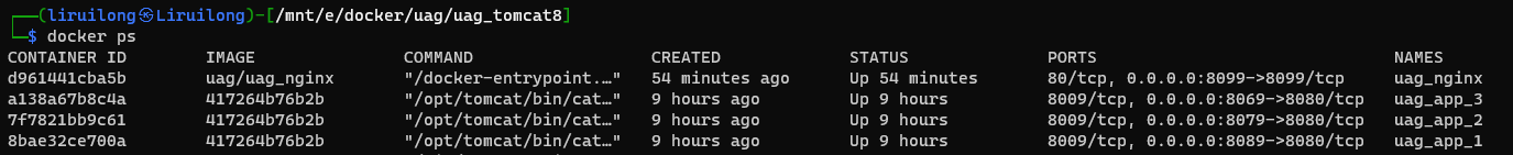 docker run -it -d -p 8089:8080 --name uag_app_1 uag/uag_tomcat docker run -it -d -p 8079:8080 --name uag_app_2 uag/uag_tomcat docker run -it -d -p 8069:8080 --name uag_app_3 uag/uag_tomcat