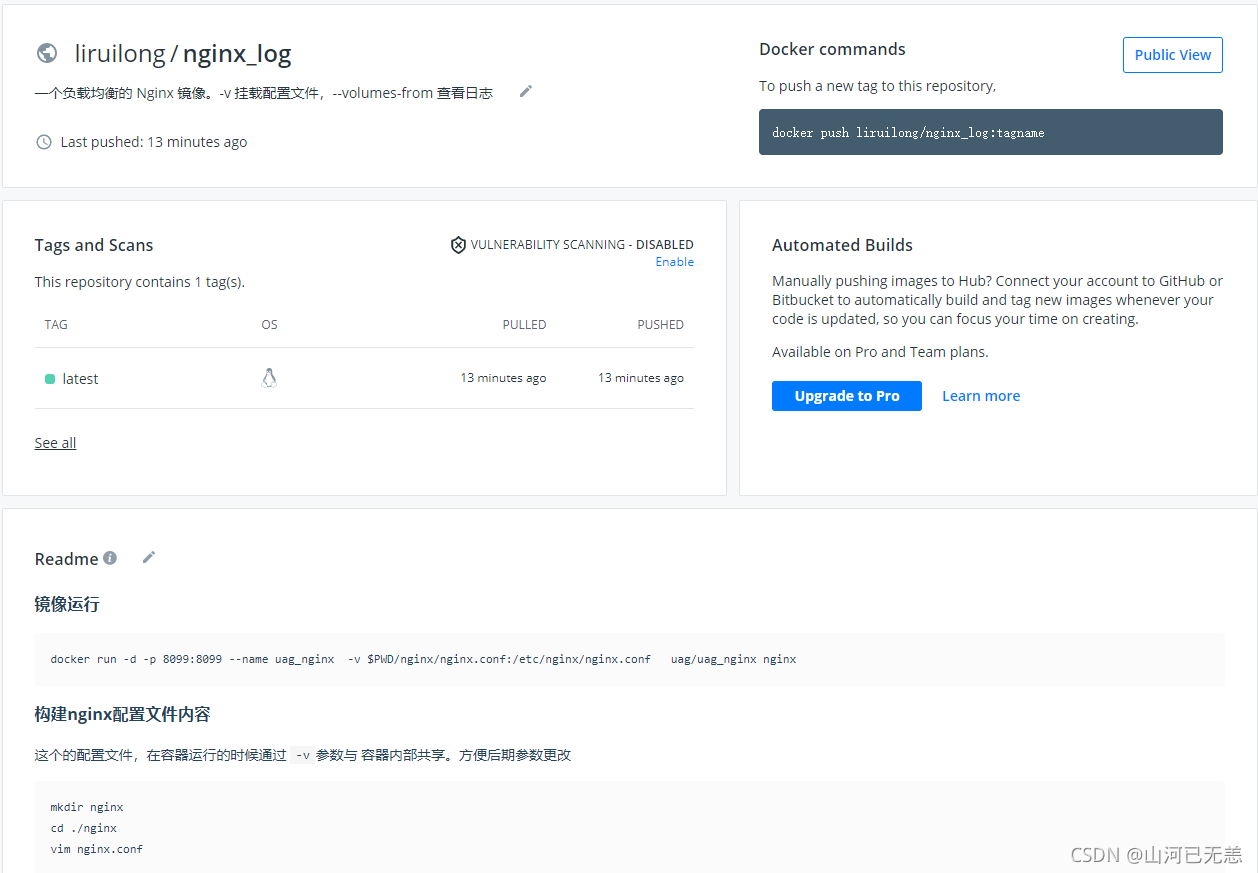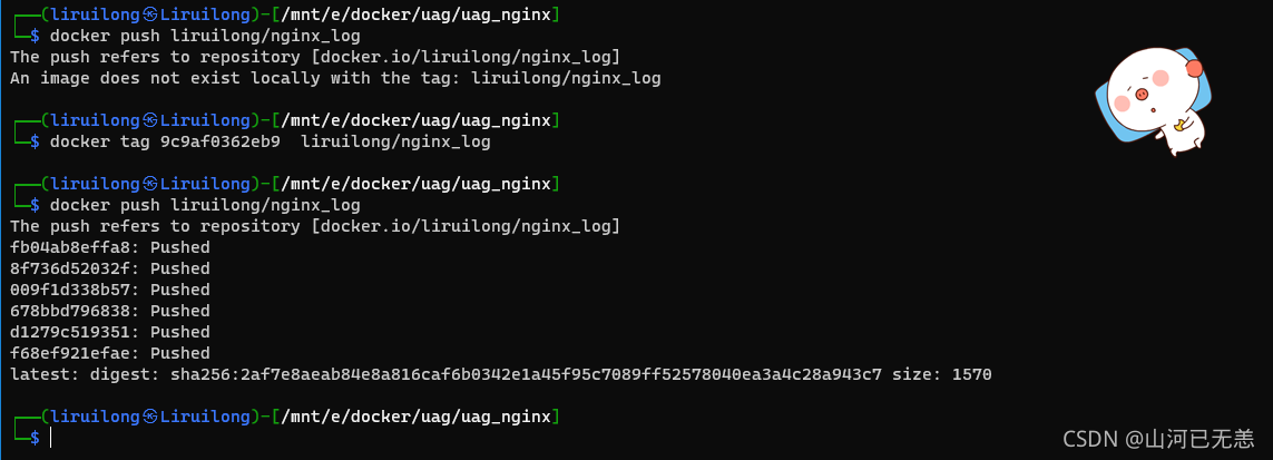 ┌──(liruilong㉿Liruilong)-[/mnt/e/docker/uag/uag_nginx] └─$ docker push liruilong/nginx_log The push refers to repository [docker.io/liruilong/nginx_log] An image does not exist locally with the tag: liruilong/nginx_log ┌──(liruilong㉿Liruilong)-[/mnt/e/docker/uag/uag_nginx] └─$ docker tag 9c9af0362eb9 liruilong/nginx_log ┌──(liruilong㉿Liruilong)-[/mnt/e/docker/uag/uag_nginx] └─$ docker push liruilong/nginx_log The push refers to repository [docker.io/liruilong/nginx_log] fb04ab8effa8: Pushed 8f736d52032f: Pushed 009f1d338b57: Pushed 678bbd796838: Pushed d1279c519351: Pushed f68ef921efae: Pushed latest: digest: sha256:2af7e8aeab84e8a816caf6b0342e1a45f95c7089ff52578040ea3a4c28a943c7 size: 1570 ┌──(liruilong㉿Liruilong)-[/mnt/e/docker/uag/uag_nginx] └─$ docker push liruilong/nginx_log:tagname # 拉去鏡像