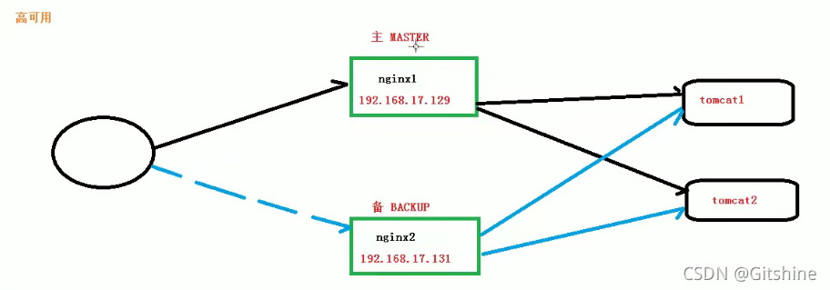 由圖可知,對于之前操作模式來說,只有一臺nginx時,將用戶的請求通過nginx進(jìn)行轉(zhuǎn)發(fā)到不同的tomcat之中,當(dāng)其中的nginx宕機(jī)時,就會造成服務(wù)的轉(zhuǎn)發(fā)失敗,因此通過搭建nginx集群,當(dāng)主服務(wù)器nginx宕機(jī)時,備份服務(wù)器的ngnix會將用戶的請求重新轉(zhuǎn)發(fā)tomcat中,從而保證了高可用。