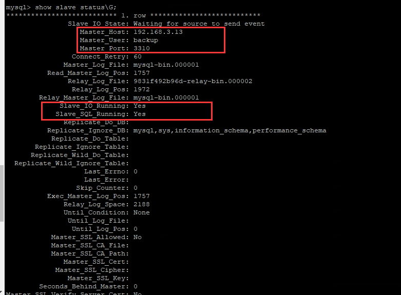 # 進(jìn)入容器 docker exec -it mysql-slave-01 /bin/bash # 進(jìn)入主庫(kù)mysql數(shù)據(jù)庫(kù) mysql -u root -p change master to master_host='192.168.3.13',master_user='backup',master_password='123456',master_log_file='mysql-bin.000001',master_log_pos=0,master_port=3310;