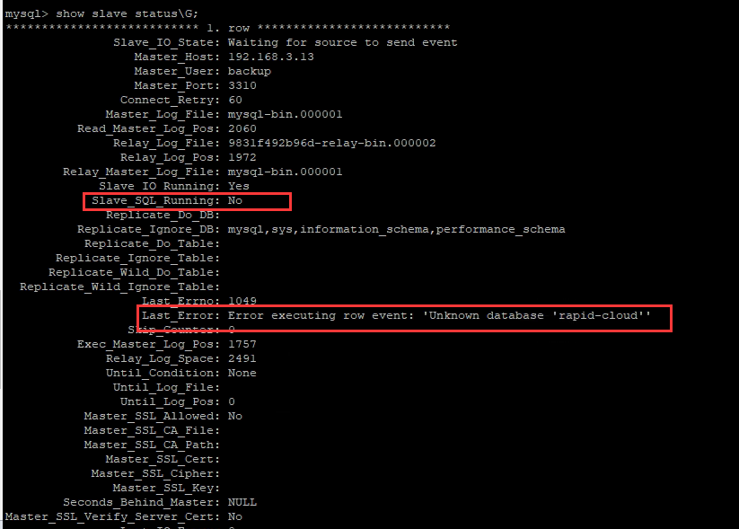 vim /home/apps/mysql-slave-01/config/my.cnf server_id=2 log-bin=mysql-bin read-only=1 binlog-do-db=rapid-cloud binlog-do-db=rapid-cloud-test replicate-ignore-db=mysql replicate-ignore-db=sys replicate-ignore-db=information_schema replicate-ignore-db=performance_schema