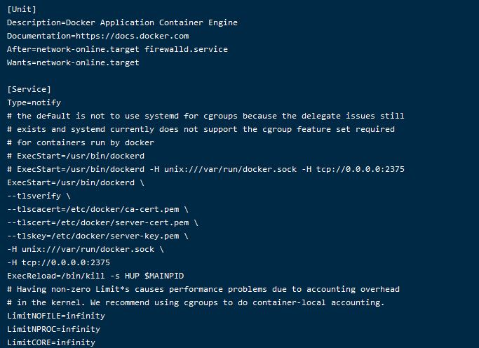 # 編輯文件 vim /etc/systemd/system/docker.service # 修改內(nèi)容,注意證書的指定位置 ExecStart=/usr/bin/dockerd \ --tlsverify \ --tlscacert=/etc/docker/ca-cert.pem \ --tlscert=/etc/docker/server-cert.pem \ --tlskey=/etc/docker/server-key.pem \ -H unix:///var/run/docker.sock \ -H tcp://0.0.0.0:2375 # 重啟服務(wù) systemctl daemon-reload && systemctl restart docker