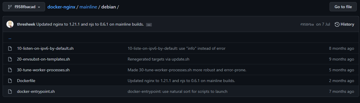 ... COPY docker-entrypoint.sh / COPY 10-listen-on-ipv6-by-default.sh /docker-entrypoint.d COPY 20-envsubst-on-templates.sh /docker-entrypoint.d COPY 30-tune-worker-processes.sh /docker-entrypoint.d ENTRYPOINT ["/docker-entrypoint.sh"] EXPOSE 80 STOPSIGNAL SIGQUIT CMD ["nginx", "-g", "daemon off;"]