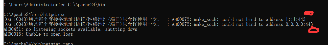 在cmd里bin目錄下執(zhí)行代碼httpd.exe為了讓它顯示出錯(cuò)誤,看到被占用的端口號(hào),從而解決問(wèn)題