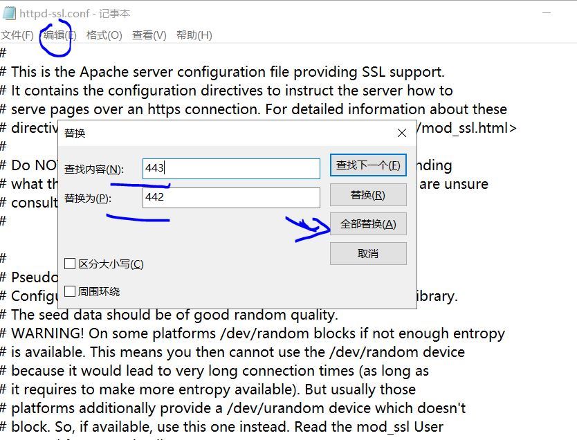 將兩個(gè)文件里的443替換成端口號(hào)里不存在的任意數(shù)字(如442)(右鍵——打開(kāi)方式——以記事本打開(kāi)——編輯——替換)