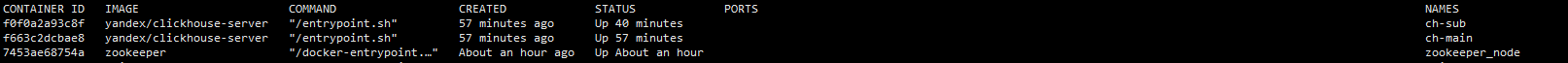 docker run -d --name=ch-sub -p 8124:8124 -p 9001:9001 -p 9010:9010 --ulimit nofile=262144:262144 \ -v /usr/soft/clickhouse-server/sub/data:/var/lib/clickhouse:rw \ -v /usr/soft/clickhouse-server/sub/conf:/etc/clickhouse-server:rw \ -v /usr/soft/clickhouse-server/sub/log:/var/log/clickhouse-server:rw \ --add-host server01:172.192.13.10 \ --add-host server02:172.192.13.11 \ --add-host server03:172.192.13.12 \ --hostname server01 \ --network host \ --restart=always \ yandex/clickhouse-server