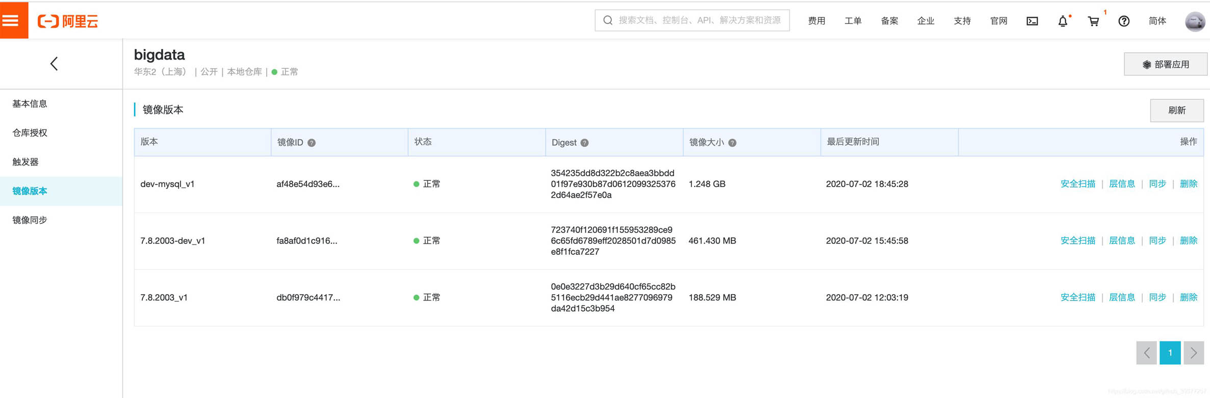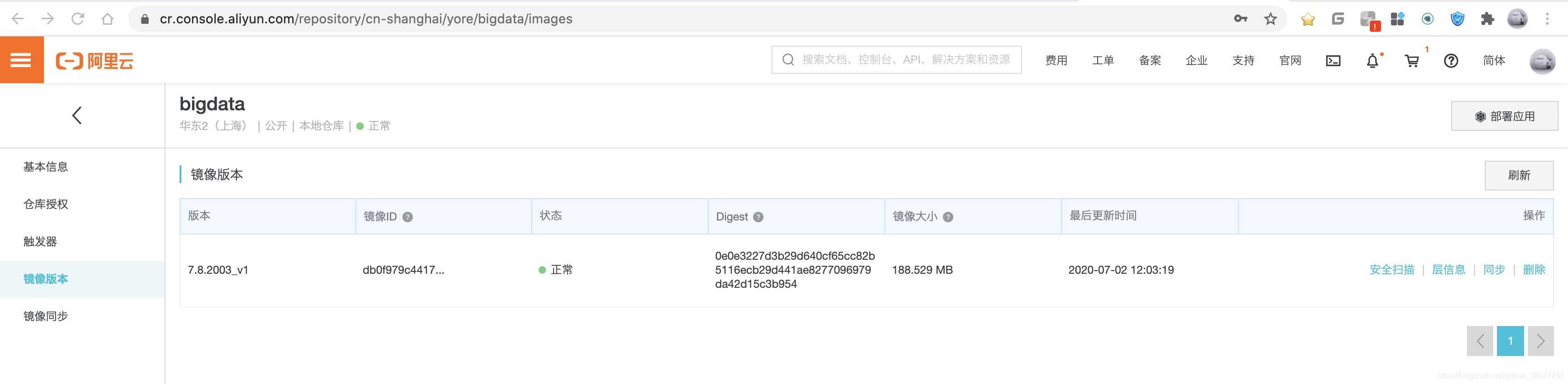 上一步提交成功后,在阿里云控制臺頁面可以看到如下我們提交的鏡像