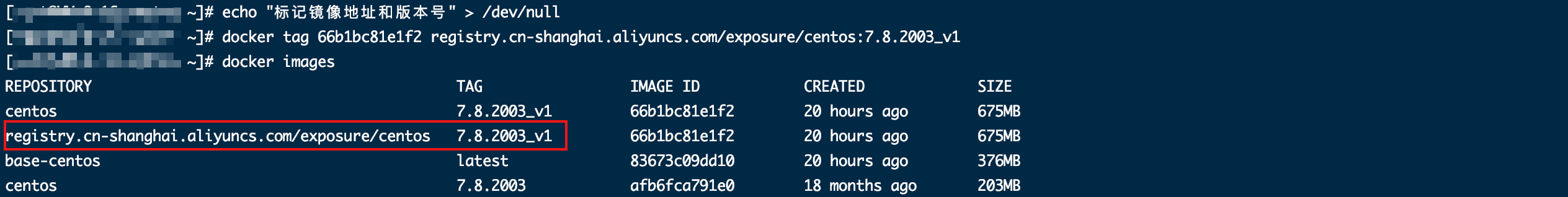 echo "標(biāo)記鏡像地址和版本號(hào)" > /dev/null docker tag 66b1bc81e1f2 registry.cn-shanghai.aliyuncs.com/exposure/centos:7.8.2003_v1