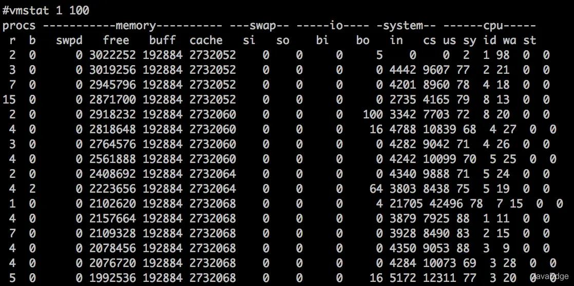 其次還要通jstack查看線程的狀態(tài),看看線程的個(gè)數(shù)或者線程的狀態(tài),如果線程數(shù)過(guò)多,可以懷疑是線程上下文切換的開銷,我們可以通過(guò)vmstat和pidstat這兩個(gè)工具進(jìn)行確認(rèn)。