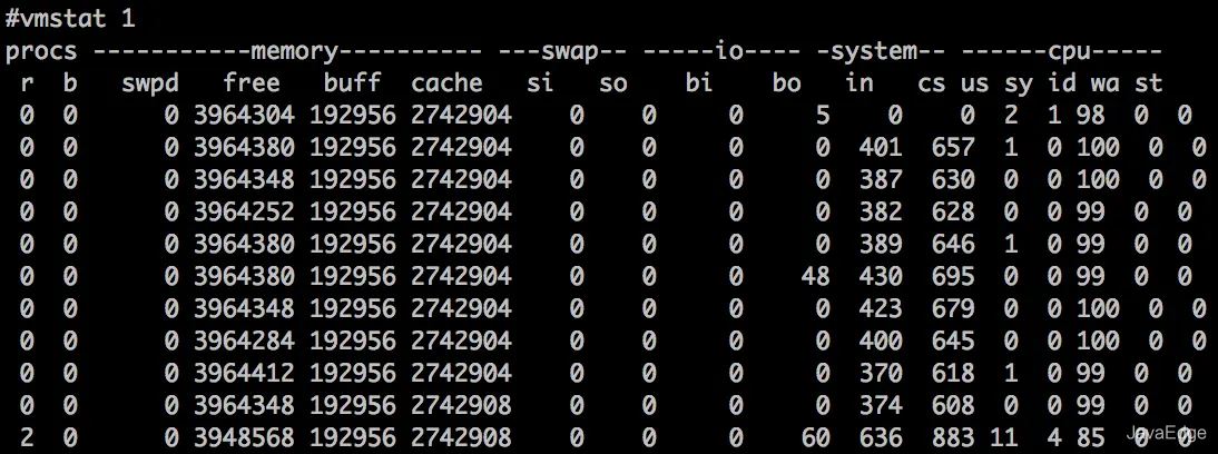 停止Spring Boot程序,再次運(yùn)行vmstat命令,會(huì)看到in和cs都大幅下降,這就證實(shí)引起線程上下文切換開銷的Java進(jìn)程正是55790。