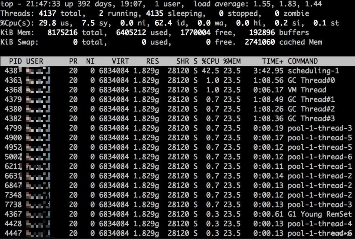 經(jīng)歷上述過(guò)程,往往已經(jīng)可以定位到大量消耗CPU的線程及bug代碼,比如死循環(huán)。但對(duì)于該案例:Java進(jìn)程占用的CPU是961.6%, 而“scheduling-1”線程只占用了42.5%的CPU,那其它CPU被誰(shuí)占用了?