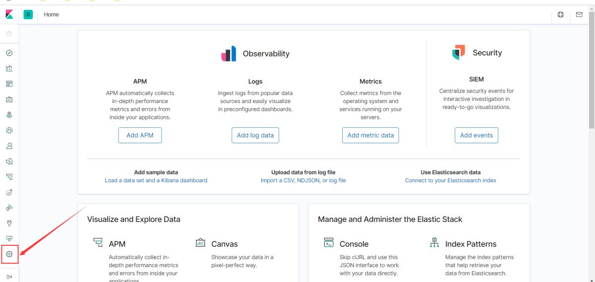 1)http://192.168.0.150:5601,訪問Kibana web界面。點(diǎn)擊左側(cè)設(shè)置,進(jìn)入Management界面