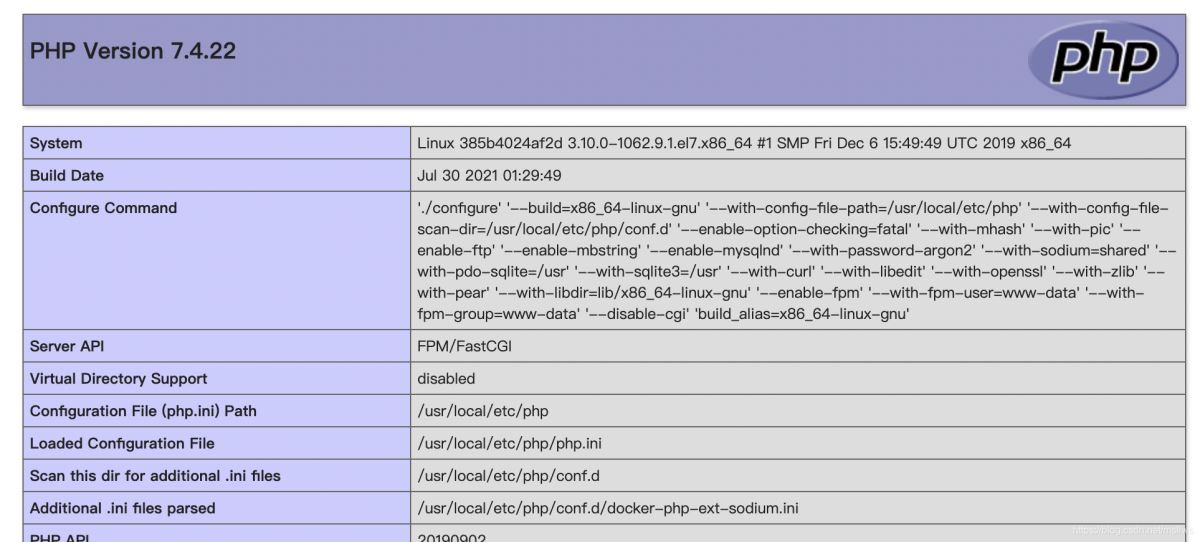 #運(yùn)行鏡像 docker run --name php7.4 --network lnmp -d php:7.4-fpm #創(chuàng)建目錄 mkdir -p /root/docker/php #移動(dòng)目錄 cd /root/docker/php/ #復(fù)制www.conf docker cp php7.4:/usr/local/etc/php-fpm.d/www.conf www.conf #進(jìn)入容器 docker exec -it php7.4 bash #移動(dòng)目錄 cd /usr/src/ #解壓文件 xz -d php.tar.xz #解壓文件 tar -xvf php.tar #退出鏡像 exit #復(fù)制php.ini docker cp php7.4:/usr/src/php-7.4.22/php.ini-production php.ini #停止鏡像 docker stop php7.4 #刪除鏡像 docker rm php7.4 #再次運(yùn)行鏡像 docker run --name php7.4 --network lnmp -v /root/docker/nginx/html:/var/www/html -v /root/docker/php/www.conf:/usr/local/etc/php-fpm.d/www.conf -v /root/docker/php/php.ini:/usr/local/etc/php/php.ini -d php:7.4-fpm