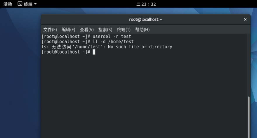 #userdel -r test(參數(shù)-r表示連同home目錄一起刪除)