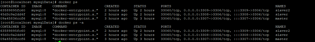 # 主服務(wù)器實例化 docker run -itd -p 3307:3306 --name master -v /usr/local/mysqlData/master/cnf:/etc/mysql/conf.d -v /usr/local/mysqlData/master/data:/var/lib/mysql -e MYSQL_ROOT_PASSWORD=123456 mysql:8 # 1號從服務(wù)器實例化 docker run -itd -p 3308:3306 --name slaver -v /usr/local/mysqlData/slave/cnf:/etc/mysql/conf.d -v /usr/local/mysqlData/slave/data:/var/lib/mysql -e MYSQL_ROOT_PASSWORD=123456 mysql:8 # 2號從服務(wù)器實例化 docker run -itd -p 3309:3306 --name slaver2 -v /usr/local/mysqlData/slave2/cnf:/etc/mysql/conf.d -v /usr/local/mysqlData/slave2/data:/var/lib/mysql -e MYSQL_ROOT_PASSWORD=123456 mysql:8