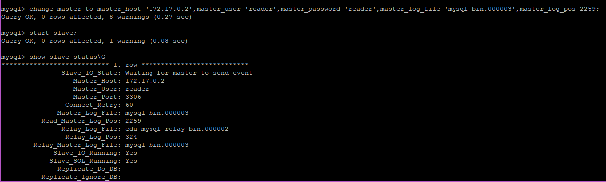 # 配置連接的參數(shù) change master to master_host='172.17.0.2',master_user='reader',master_password='reader',master_log_file='mysql-bin.000003',master_log_pos=2259; # 啟動同步 start slave; # 查看是否成功 show slave status\G # 兩項都為Yes時代表成功。 # Slave_IO_Running: Yes # Slave_SQL_Running: Yes # 失敗需要使用停止連接后檢查其他賬號密碼,地址,pos等參數(shù) # 停止連接,如果一次成功無需使用該命令 stop slave;