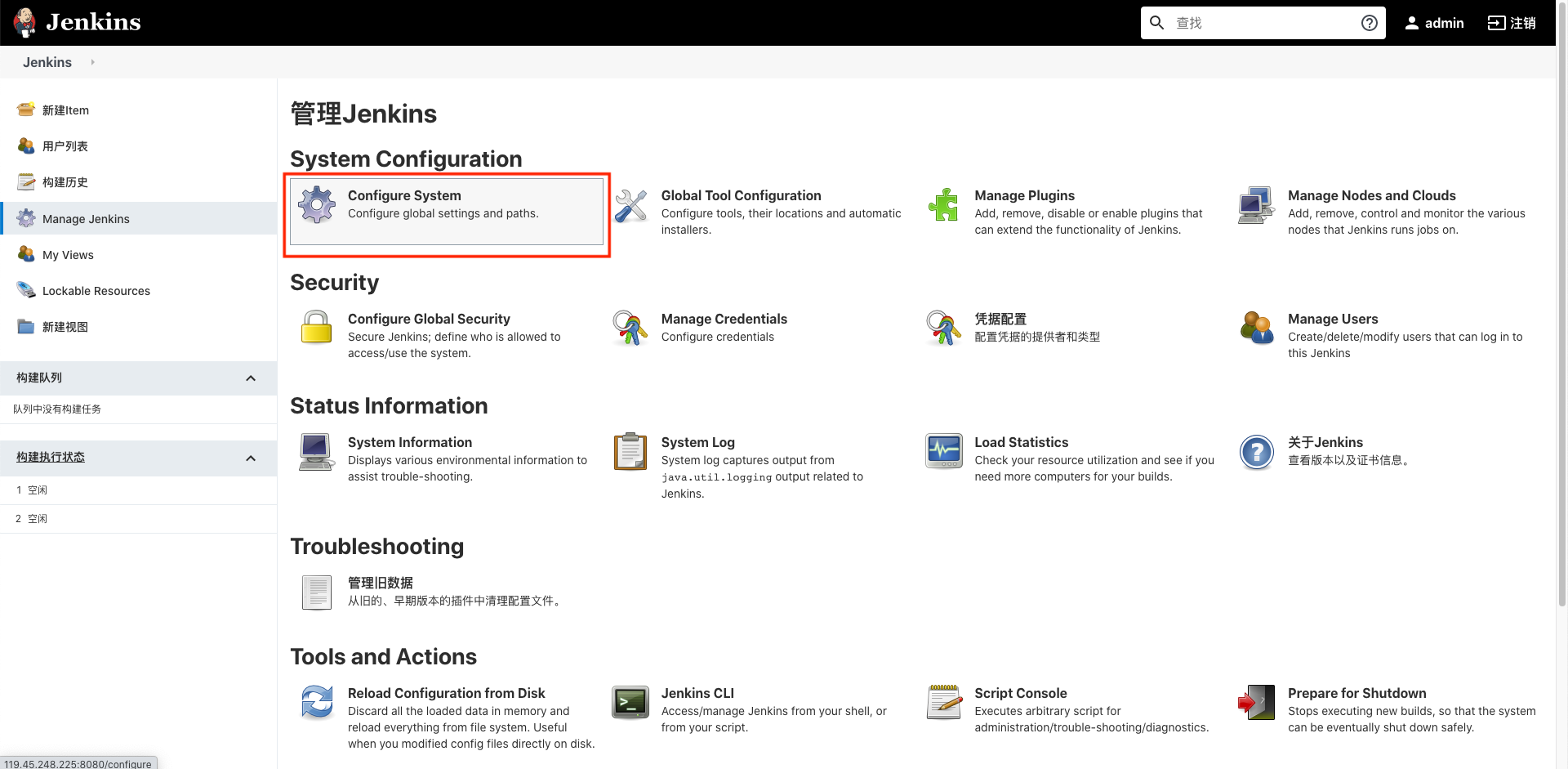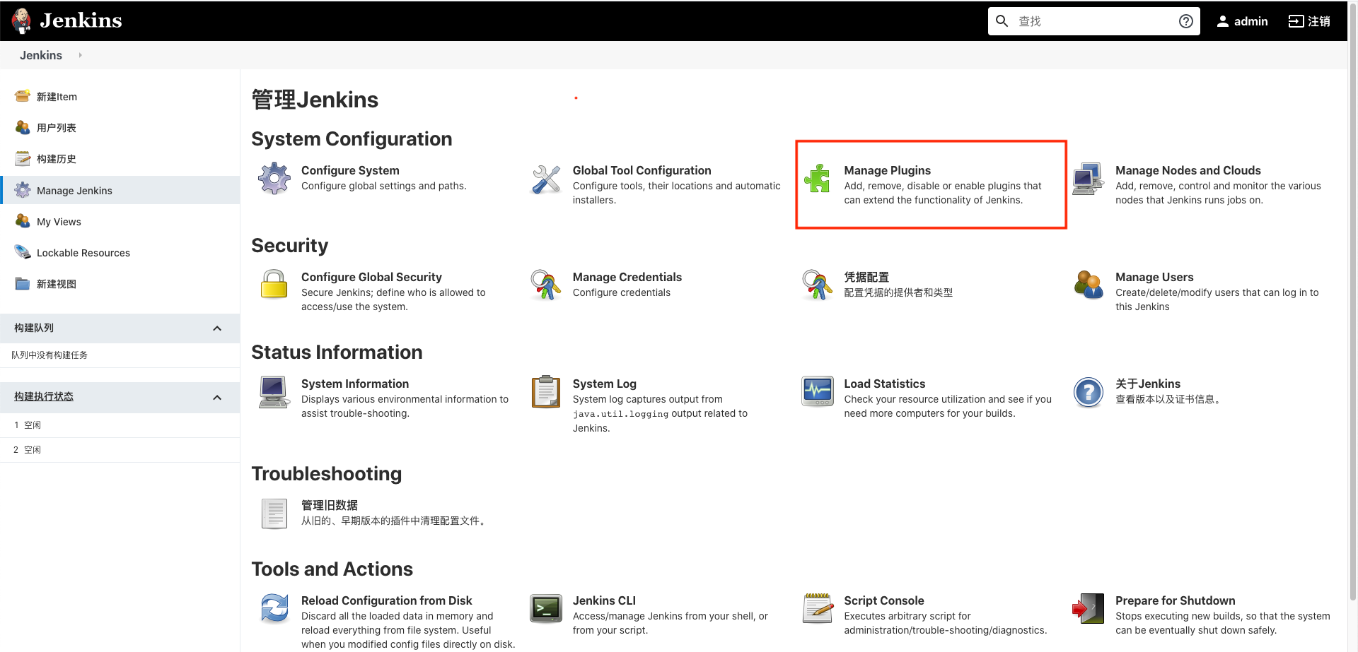 安裝完成之后,選擇左側(cè)Manage Jenkins選項(xiàng)。如下圖所示: