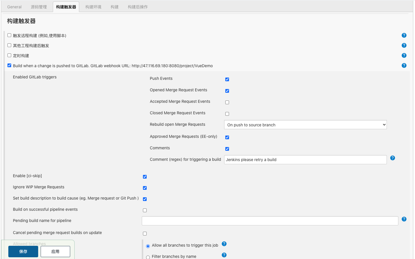 在構(gòu)建觸發(fā)器中選擇我們觸發(fā)構(gòu)建的時(shí)機(jī),你可以選擇隊(duì)友的鉤子,比如push代碼的時(shí)候,Merge Request的時(shí)候: