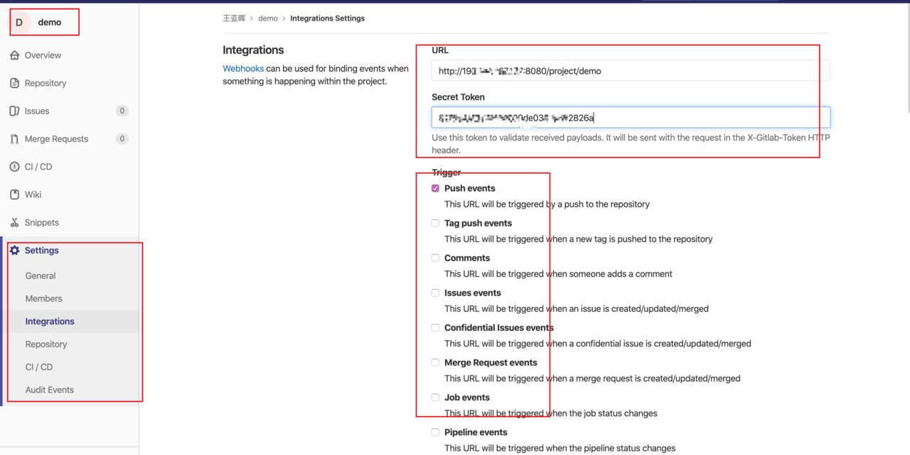 配置成功后,還需要到GitLab中增加對應(yīng)的鉤子。記下上圖的webhookURL(紅線框出)和secret token值,到GitLab中進(jìn)行配置。
