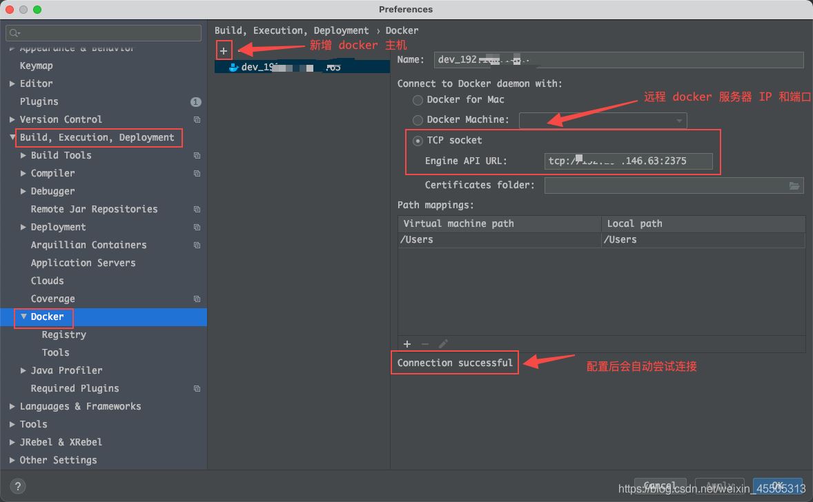 重啟后可以通過 Build,Execution,Depolyment ——> Docker 路徑找到 Docker 插件,再此新增一個(gè)連接遠(yuǎn)程 Docker 的配置
