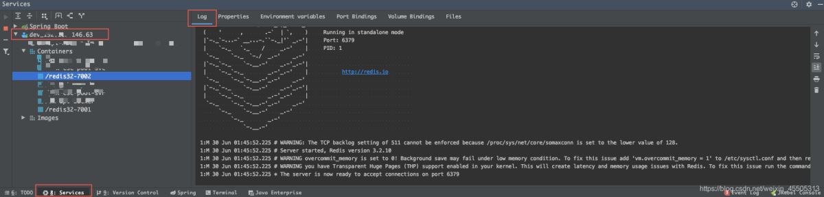 連接成功后,在 IDEA 插件面板中可以查看遠(yuǎn)程 docker 主機(jī)的鏡像和容器,也可以查看容器運(yùn)行的日志等信息