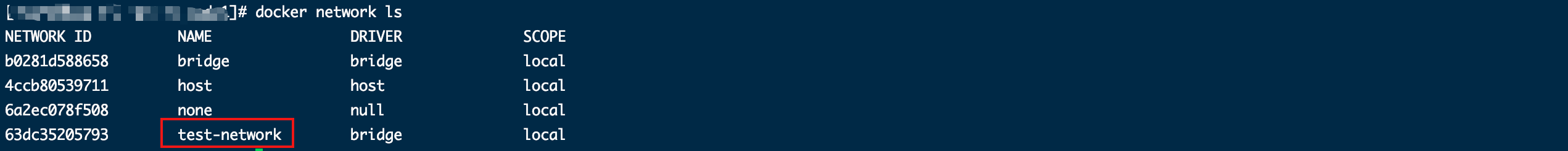 列出Docker下所有網(wǎng)絡(luò)可以看到test-network。