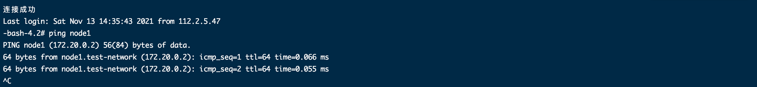同一網(wǎng)絡(luò)下,容器通過網(wǎng)絡(luò)別名(–network-alias)來互相訪問。下圖中連接到node2容器,在容器內(nèi)可以ping通node1,網(wǎng)絡(luò)是通的。