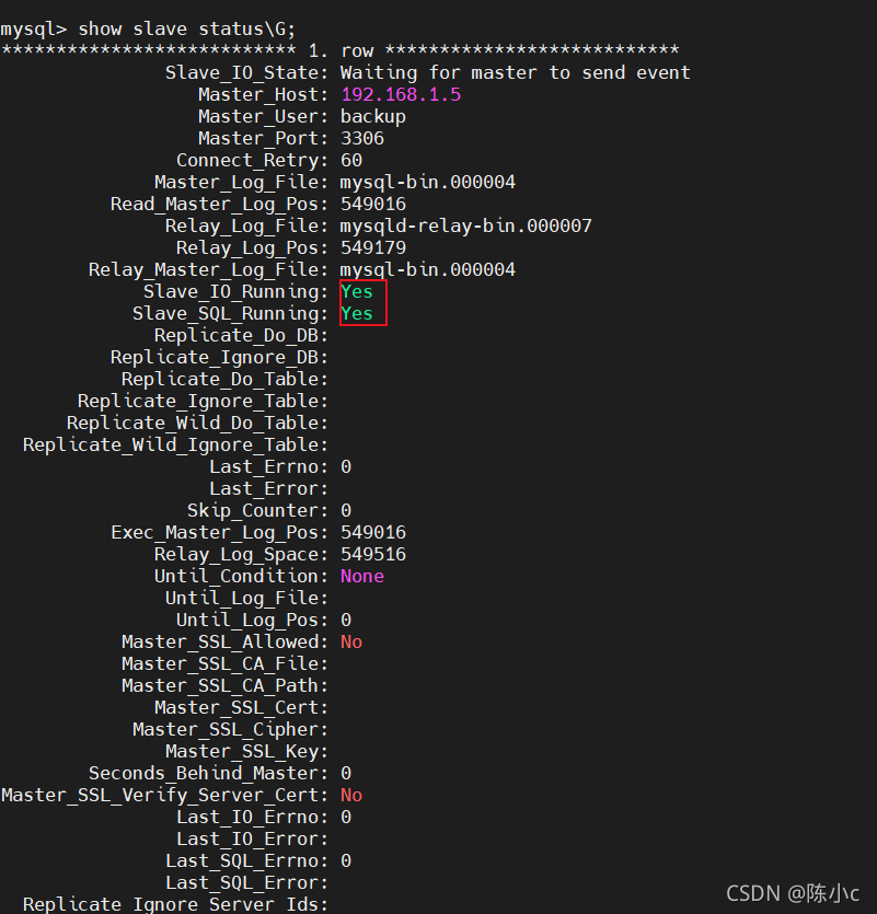 docker exec -it mysql-slave /bin/bash ## 進(jìn)入從庫 mysql -u root -p123456 ## 登陸mysql change master to master_host='192.168.1.5', master_port=3306,master_user='bakup',master_password='bakup', master_log_file='mysql-bin.000001',master_log_pos=154; ##配置主從連接 start slave; ## 啟動(dòng)從庫備份 show slave status\G; ##查看狀態(tài)