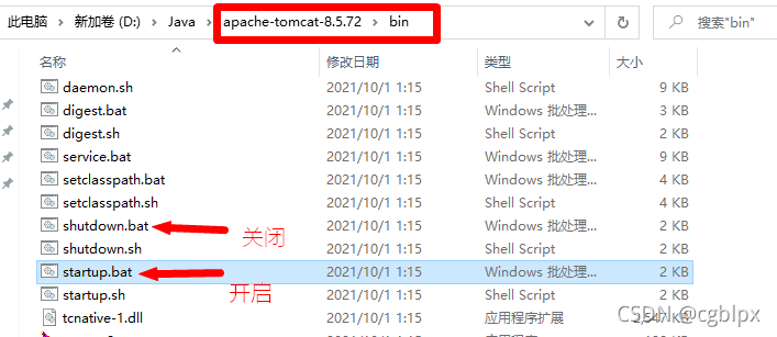 D:\Java\apache-tomcat-8.5.72\bin: 存放tomcat服務(wù)器中可執(zhí)行文件的目錄
