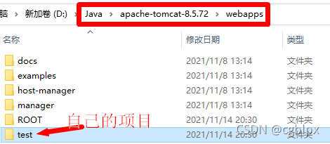 D:\Java\apache-tomcat-8.5.72\webapps: 是localhost虛擬主機(jī)默認(rèn)管理的目錄,你開發(fā)好的項目代碼必須在webapps目錄下才可以通過瀏覽器訪問你的程序,包括各種資源(html、css、js、jsp、servlet、圖片等)和目錄等