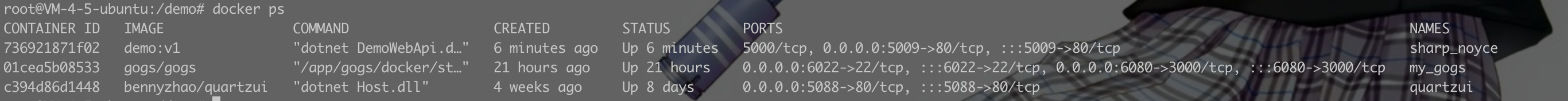 docker run --name demoapi -dp 5009:80/tcp demo:v1
