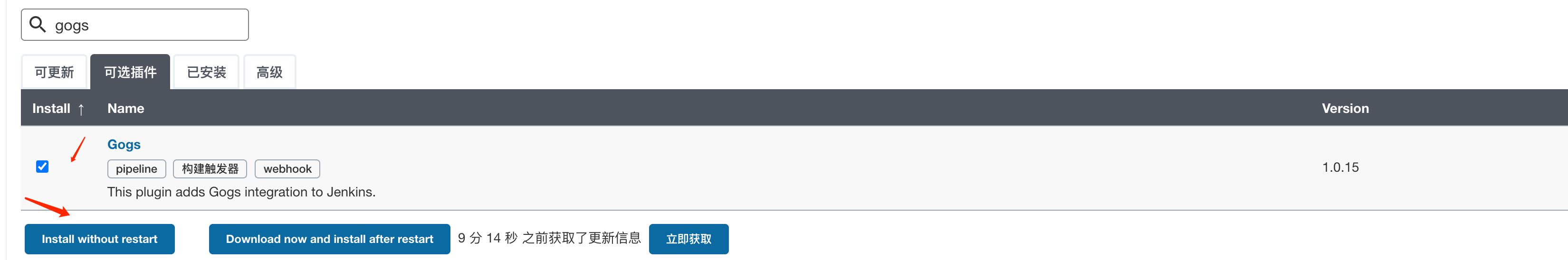 結束后創(chuàng)建管理賬號登錄即可,進入系統(tǒng)管理,選擇插件管理,搜索gogs插件后安裝。