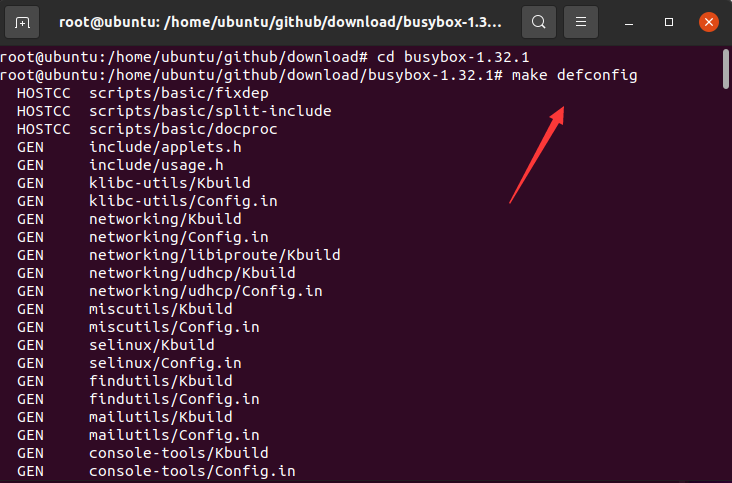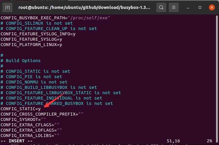 2、編譯busybox與編譯內(nèi)核步驟基本一致,將下載好的壓縮包進(jìn)行解壓,然后進(jìn)入文件夾中,使用make defconfig配置默認(rèn)編譯選項(xiàng),這里需要注意的是,在生成的.config配置文件中,需要設(shè)置CONFIG_STATIC=y,如果沒有,添加即可,如下圖所示: