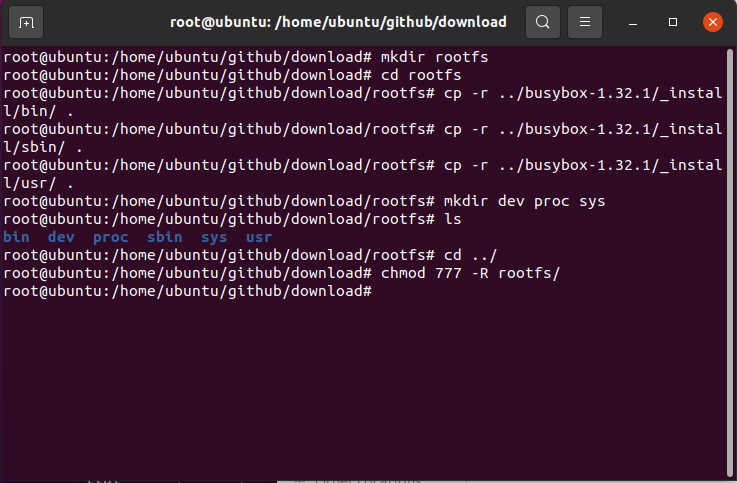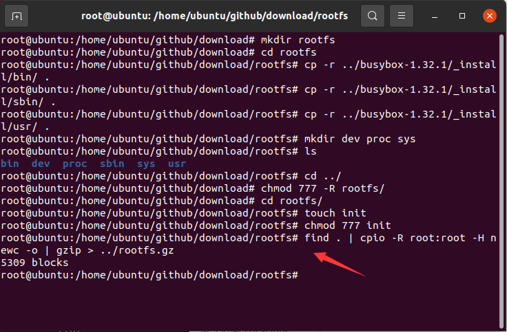 5、最后利用命令find . | cpio -R root:root -H newc -o | gzip > ../rootfs.gz將文件系統(tǒng)打包,至此,一個(gè)文件系統(tǒng)就創(chuàng)建完成了,如下圖所示: