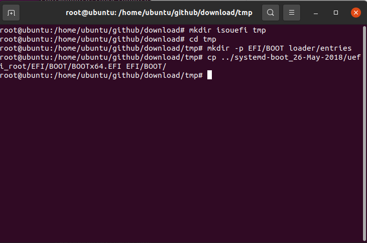 1、uefi這里采用system-boot和syslinux配合來制作,首先,創(chuàng)建兩個(gè)文件夾isouefi和tmp,其中,isouefi用來掛載設(shè)備,tmp文件夾用來臨時(shí)存放文件以計(jì)算大小,然后在tmp文件夾下面創(chuàng)建EFI/BOOT和loader/entries目錄,接著,將解壓后的systemboot下面的uefi_boot/EFI/BOOT/BOOTx64.EFI文件拷貝到tmp/EFI/BOOT目錄下面,如下圖所示: