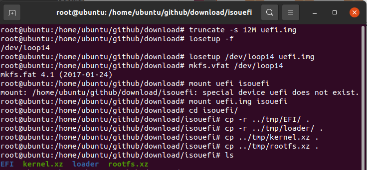 3、此時(shí)就可以根據(jù)tmp文件夾的總大小創(chuàng)建一個(gè)相同大小的img文件了,這里的tmp是11M,為了穩(wěn)妥起見,這里創(chuàng)建一個(gè)12M的img文件,命令為truncate -s 12M uefi.img,然后使用losetup -f命令尋找一個(gè)當(dāng)前未使用的邏輯設(shè)備,然后使用losetup命令將我們前面創(chuàng)建的img文件虛擬成改邏輯設(shè)備,接著利用mkfs.vfat將該設(shè)備格式化成vfat系統(tǒng),接著使用mount命令將其掛載到isouefi文件夾下面,最后將tmp文件夾下面所有文件及其文件夾拷貝到isouefi目錄下面,如下圖所示: